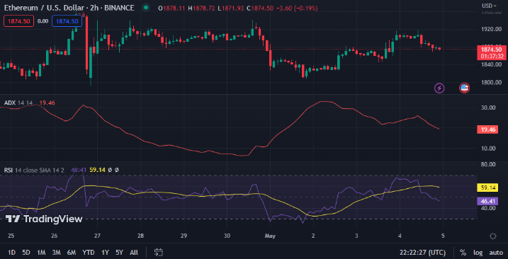The positive momentum failed to break beyond the 24-hour high of $1,915.87 due to the market slowing. As a result of this setback, bears seized control of the ETH market, sending the price down to an intraday low of $1,868.63. Bears remained in control of the ETH market at the time of writing, inflicting a 1.01% drop to $1,874.09.