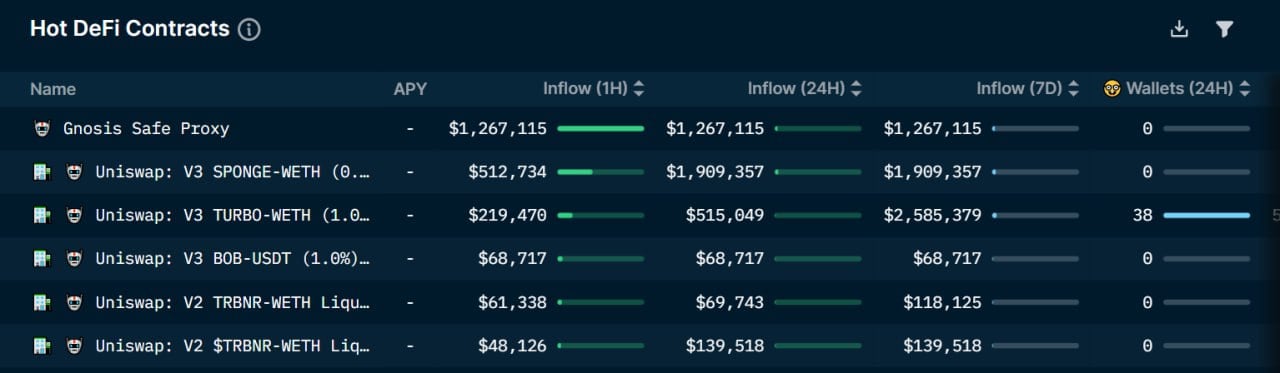 Data from crypto analytics firm Nansen shows that the most active smart contracts on Ethereum are currently Uniswap trading pools for meme coins such as SPONGE, TURBO, BOB, and TRBNR.