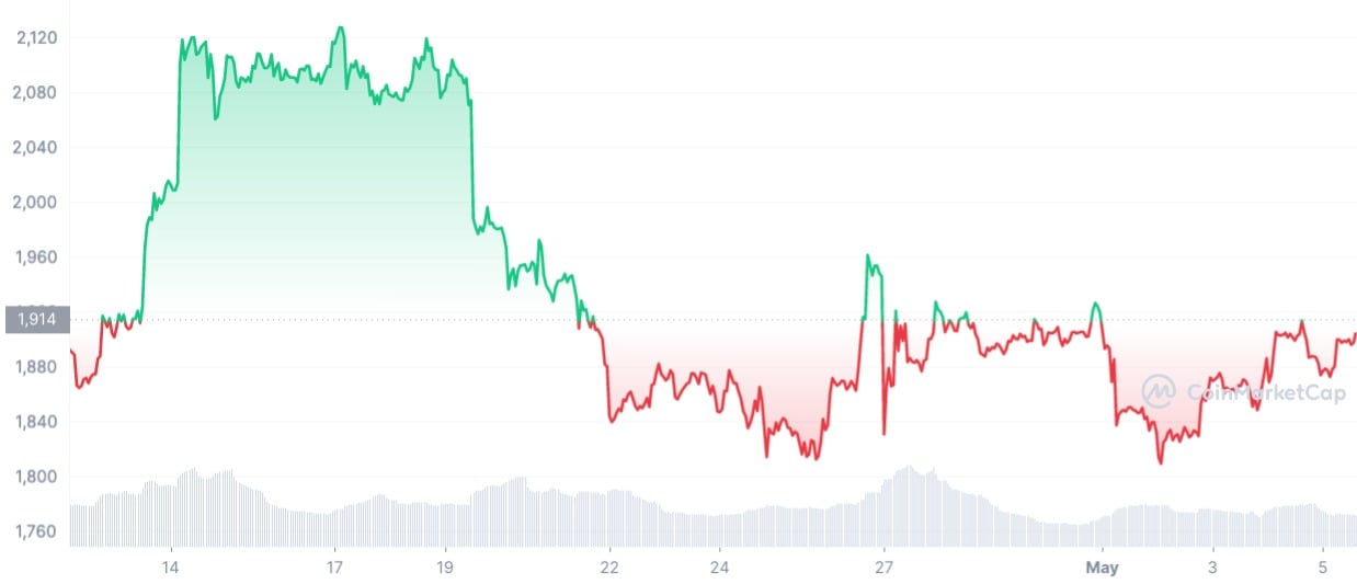 As of this writing, Ethereum is trading at $1,903 per token. After the price of ETH showed a 14% and 12% rise and fall from April 10 to April 24, respectively, its volatility has decreased so much over the past two weeks that the maximum spread does not exceed $180.