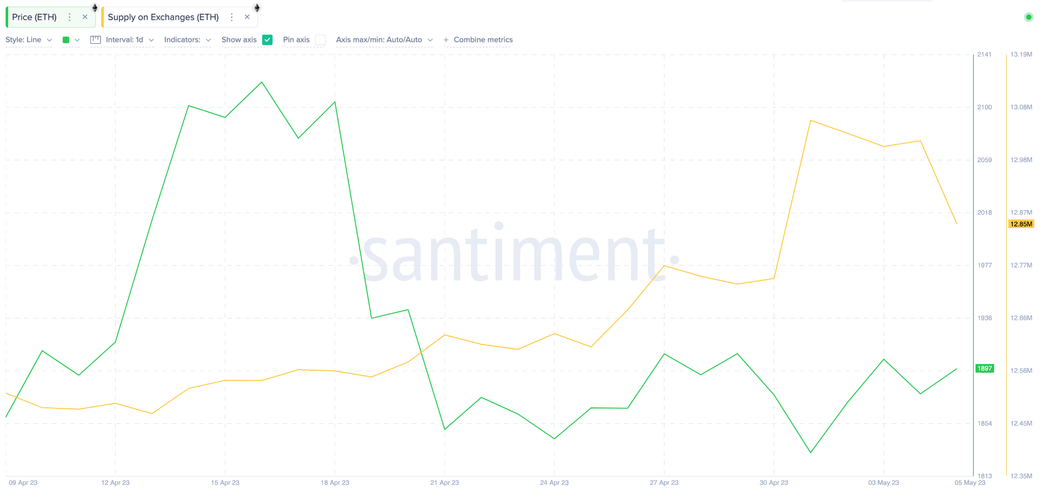 Since the beginning of May, Ethereum investors have been moving their ETH coins off exchanges, according to the data from Santiment. Evidently, the chart below depicts how the total ETH Supply on Exchanges has reduced by 210,000 coins between May 1 and May 5.