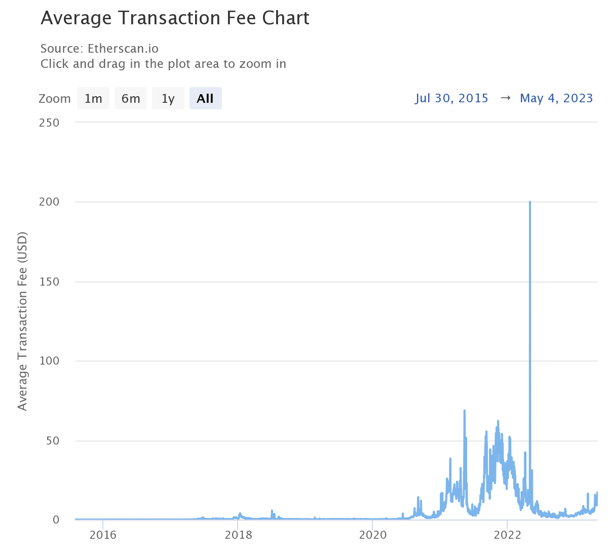 The cost of sending transactions rose as high as $15 on May 4, its highest point in over a year. Gas fees had previously stayed at lower levels in the months after Terra crashed and the crypto markets nosedived.