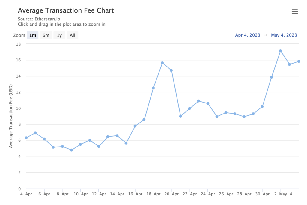 As of May 4, transaction fees on Ethereum rose to over $15. While the average gas cost on Ethereum swung between $50 and $70 in 2021, transaction costs fell rapidly during the crypto winter of 2022 only to begin rising this year.