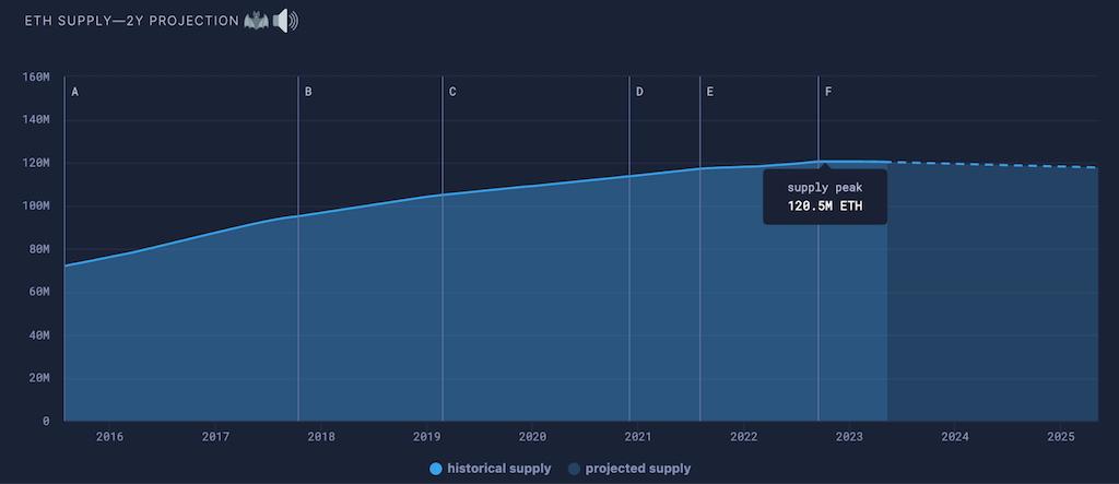 The total ether supply is now projected to have peaked in March at 120.5 million ETH, and has declined by about 100,000 ETH since then, according to data from Ultrasound Money.