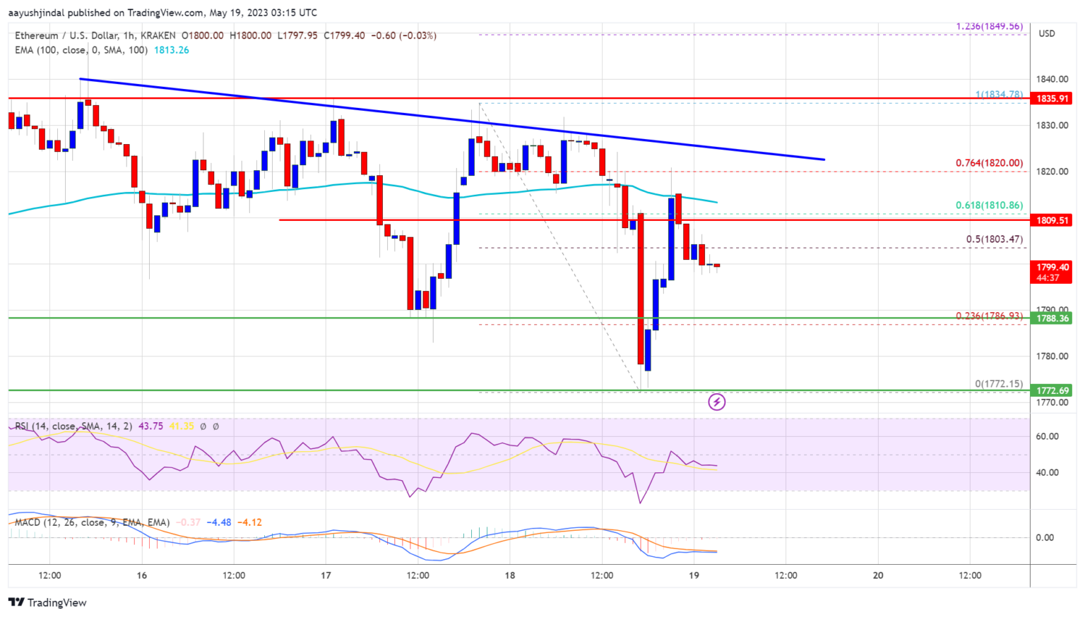 If Ethereum fails to clear the $1,825 resistance, it could start another decline. Initial support on the downside is near the $1,785 level.