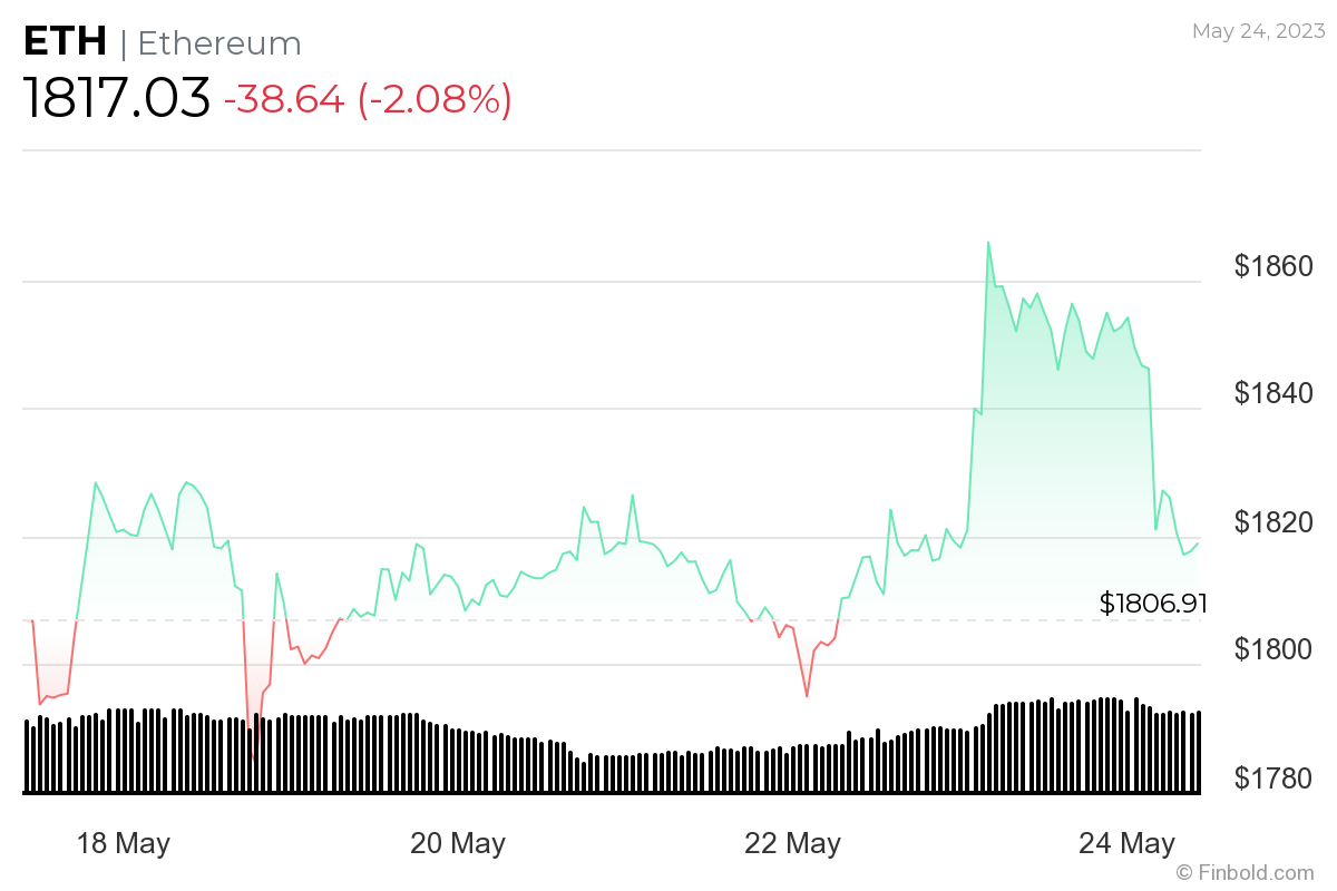 In the meantime, Ethereum was at press time changing hands at the price of $1,817, recording a decrease of 2.08% in the last 24 hours but a 0.56% gain across the previous seven days as it tries to come back from the 1.30% drop over the past month, as per data on May 24.