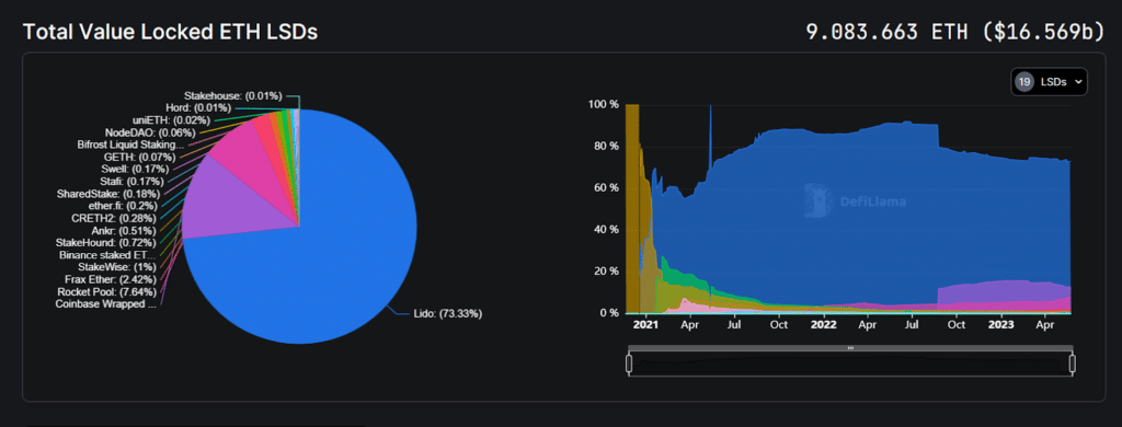 All of these providers such as Lido, Ricoket Pool, Frax, and Stakewise hold a total staking share of 9,083,663 ETH ($16.57 billion), which corresponds to almost half of all ETH locked in the Beacon Chain.