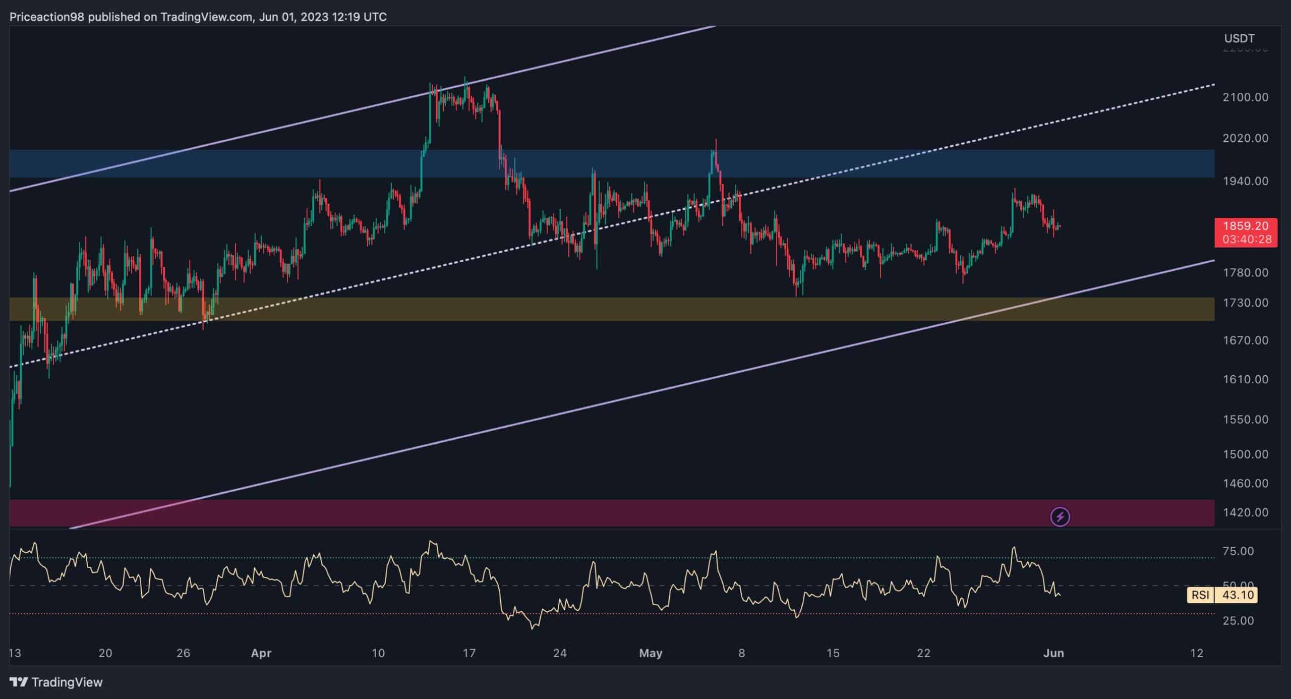 Taking a closer look at the 4-hour chart, three significant price regions present challenges for Ethereum buyers and sellers: the static resistance at $2K, the dynamic resistance from the mid-trendline of the ascending channel, and the dynamic support provided by the channel’s lower threshold.