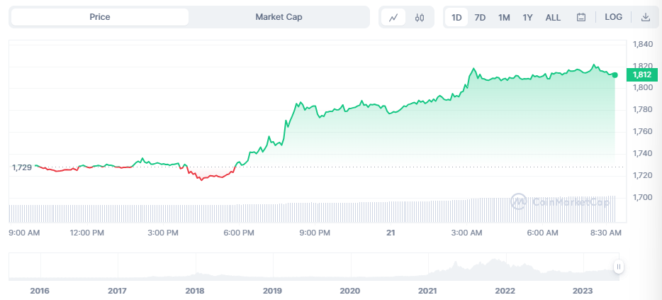 At press time, the altcoin was trading at $1,812 after it printed a 4.76% gain over the past 24 hours according to CoinMarketCap. This positive daily performance flipped ETH’s weekly performance into the green, which stood at +4.09% as a result.