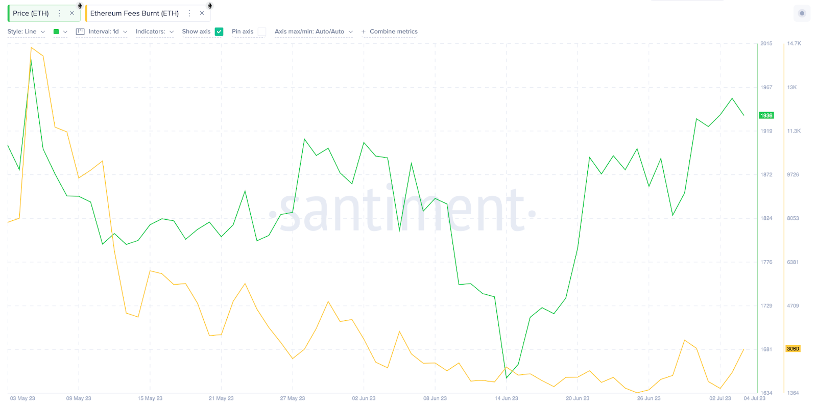 In the two months between May 5 and July 4, daily ETH burned declined by 80%, from 14,967 to 3,060.