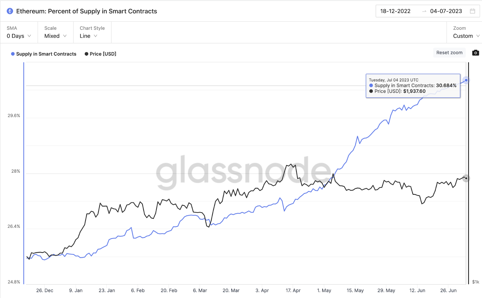The chart below shows that between June 1 and July 4, ETH holders locked up an additional 1 million ETH coins. This brings the total ETH staked to about 30.6% of the total circulating supply.