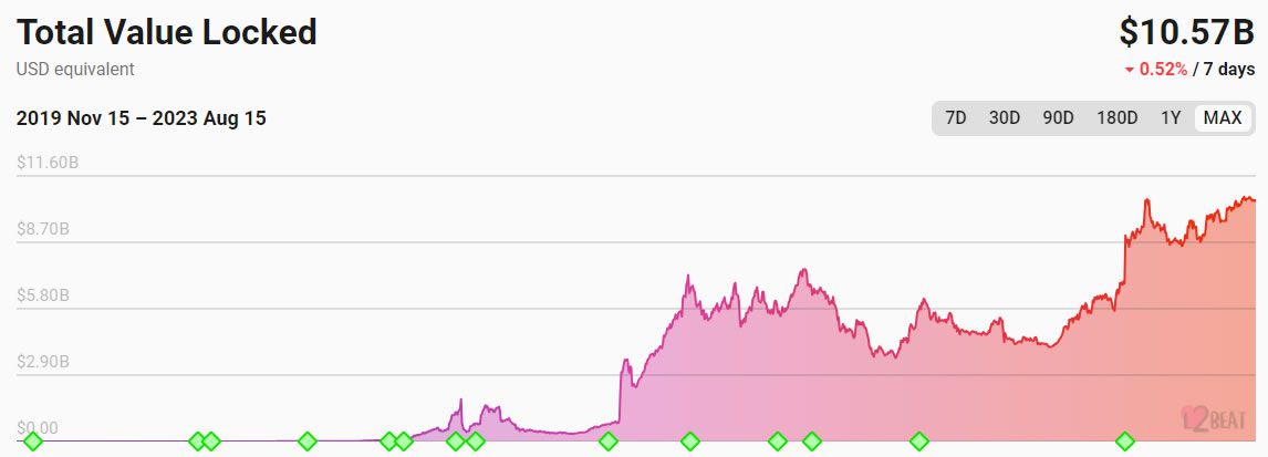 Despite a weakened crypto market, the layer-2 ecosystem has exploded over the past two years. This year alone has seen total value locked surge 158% to an all-time high of $10.6 billion, according to L2beat.