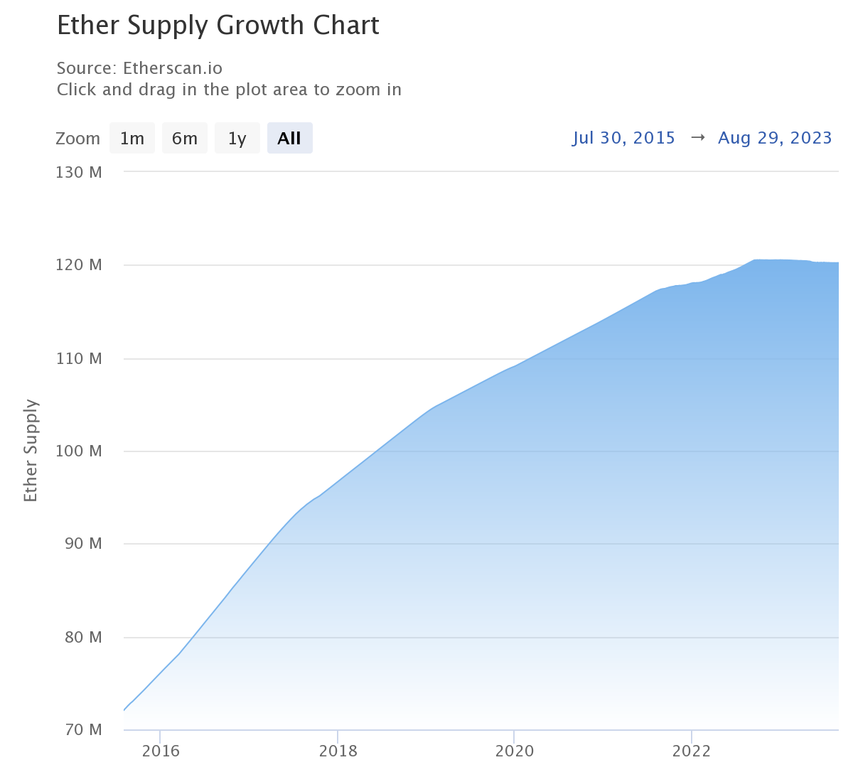 Growth of the ETH supply from July 2015 to August 2023. Image source: Etherscan
