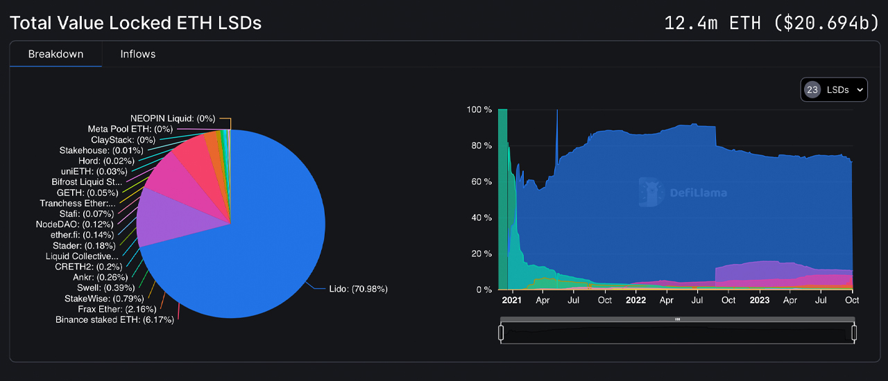 Since 2020, applications for liquid staking on the Ethereum blockchain have seen steady growth, and as of the first week of October 2023, a total of 23 liquid staking derivatives (LSD) platforms hold 12.4 million ether, valued at over $20 billion. Currently, the top three LSD protocols hold sway over 11.041 million $ETH, accounting for a substantial 89.18% share of the overall ether locked.