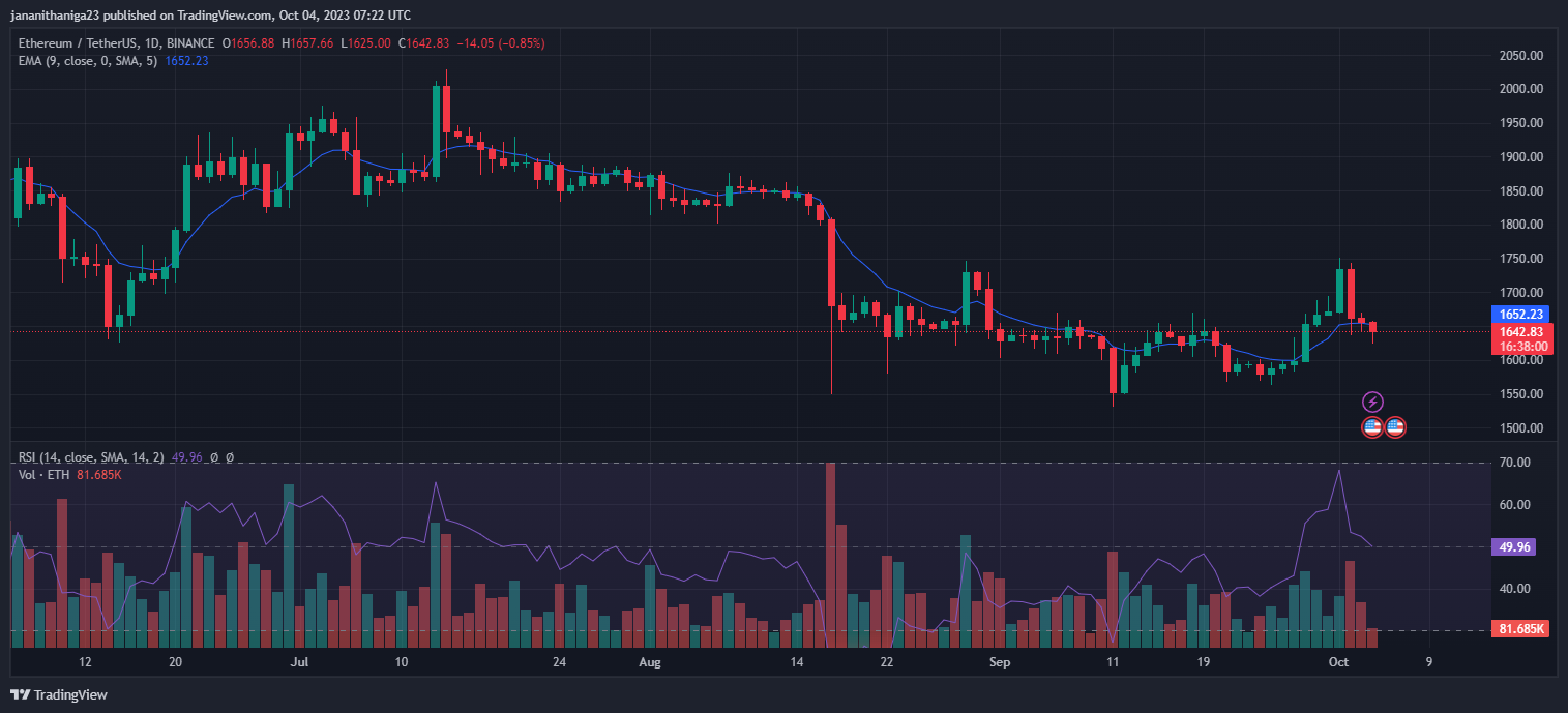 A closer analysis of Ethereum’s current price movements reveals an intense battle between bearish and bullish forces on the daily chart. The 9-day exponential moving average (EMA) has moved above the current trading price, settling at $1,652, while the daily relative strength index (RSI) stands at 49, indicating a neutral market sentiment. This suggests that Ethereum’s market is at a pivotal moment, with both buyers and sellers striving for control.