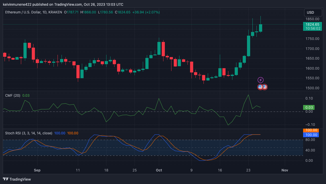 In the whirlwind of these market activities, Ethereum’s price action responds positively. Short sellers, caught off-guard, are contributing to the momentum, inadvertently boosting prices as they scramble to cover their positions. The ETH price, consequently, breached the $1,850 barrier on October 24.