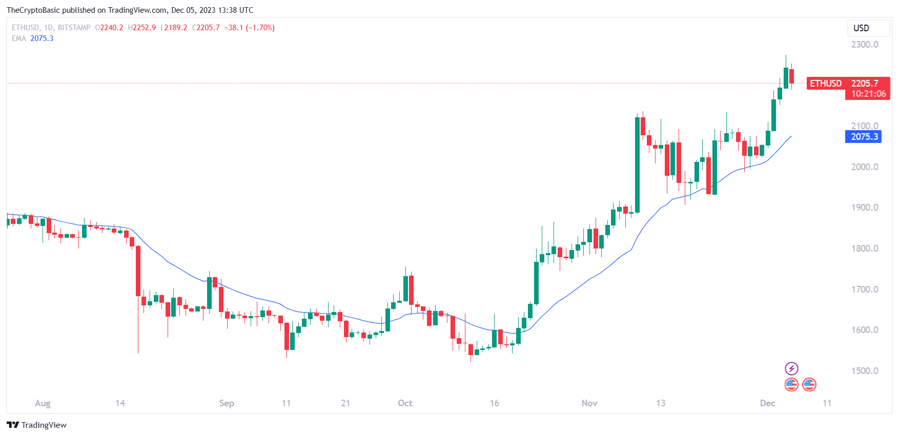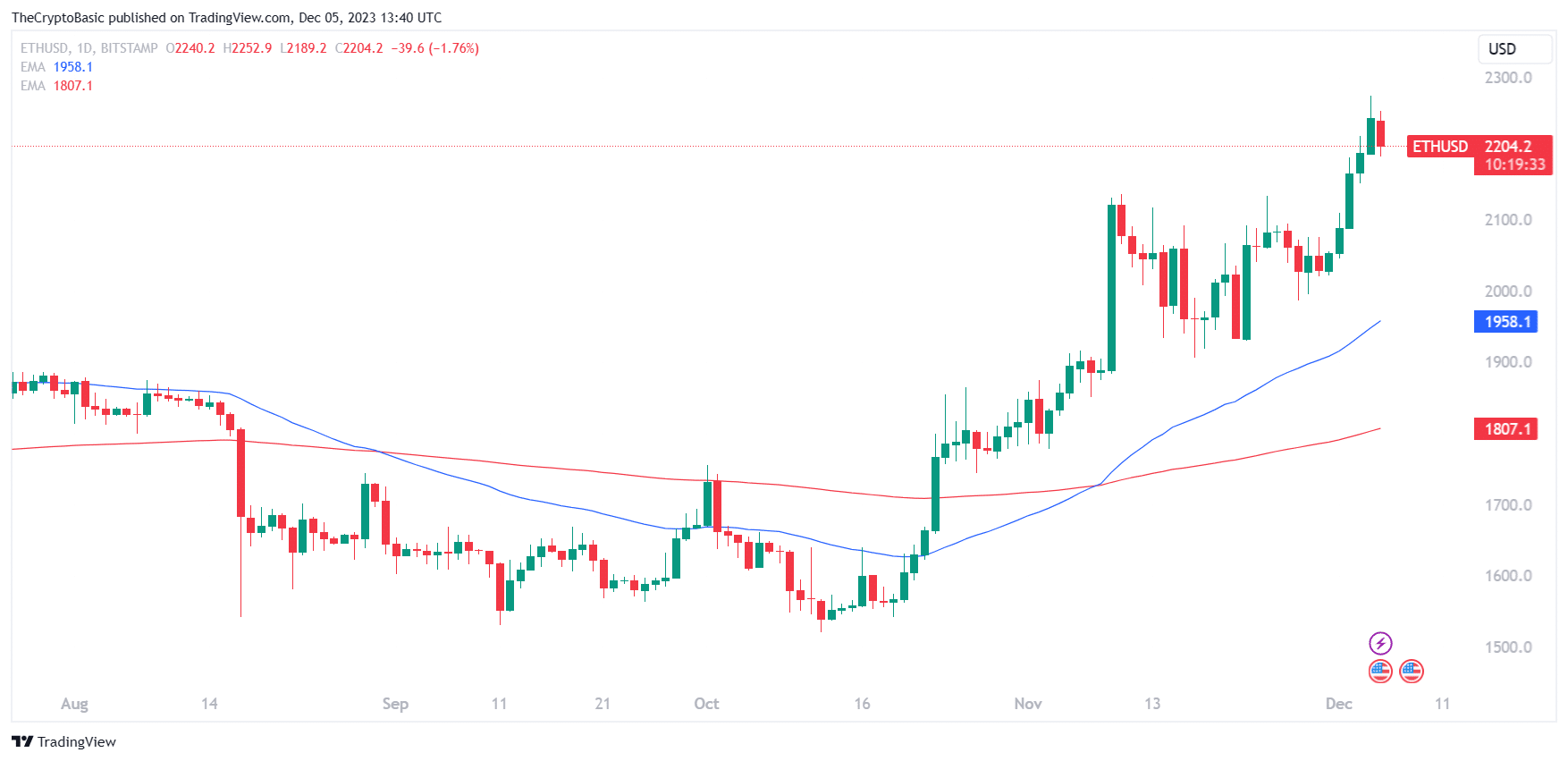 A second indicator of Ethereum’s favorable position is its price above the 50-day EMA ($1,958) and 200-day EMA ($1,807). Currently trading for $2,204, ETH is way above these moving averages, signaling bullish momentum in the short and long terms. In addition, the 50-day EMA recently crossed above the 200-day EMA, marking a golden cross.