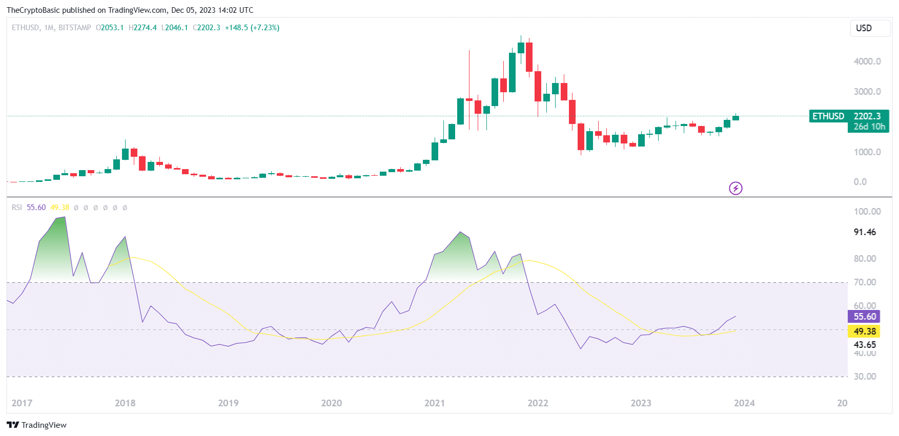 Moreover, on the monthly timeframe, things are also looking good for Ethereum. Despite the recent price surge, the monthly Relative Strength Index (RSI) remains in a fairly stable position, currently at 55.
