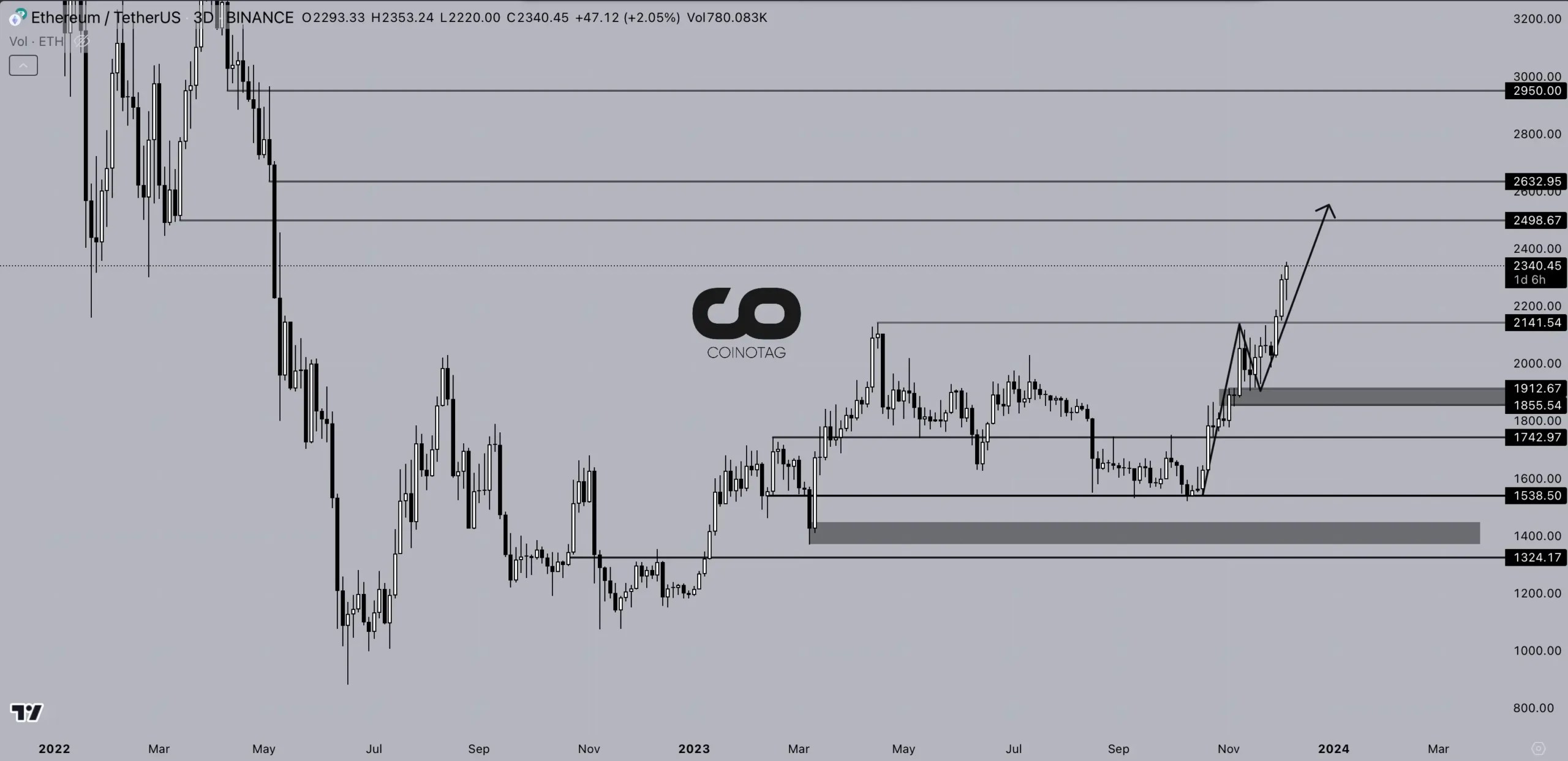 According to the 3-day technical chart of Ethereum, ETH price has experienced a more than 5% increase today by surpassing the $2140 resistance. As long as ETH remains above $2140, it may continue its upward movement towards the resistance range of $2500 – $2632.