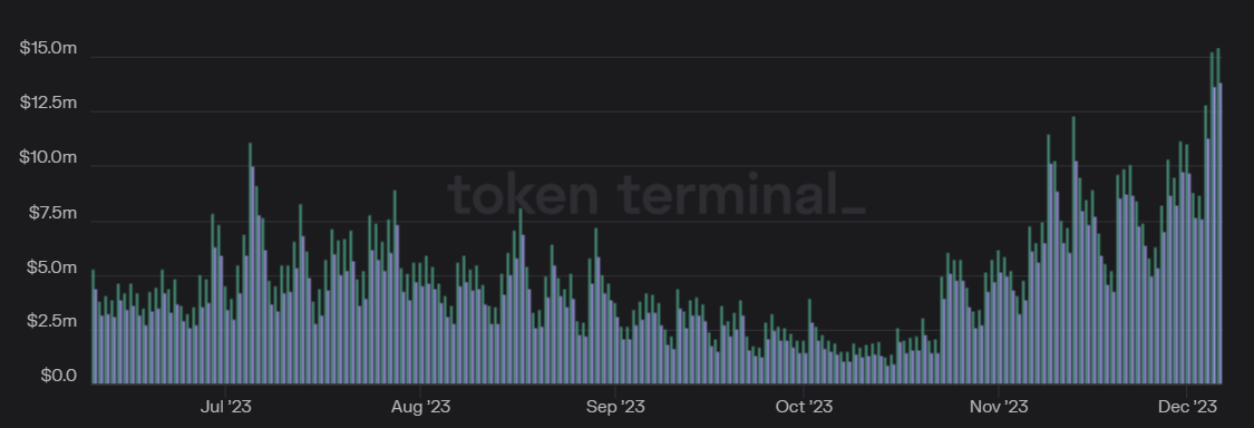 The Ethereum network’s decentralized finance (DeFi) ecosystem also witnessed a boost in daily fees and revenue, reaching a 180-day high in both categories on Dec. 7. In 30 days, fees grew over 155%, in tandem with Ether’s price growth. With the increase in Ether fees, the Ethereum network revenue is up 178.2% in the past 30 days, which equates to $2.92 billion annualized.
