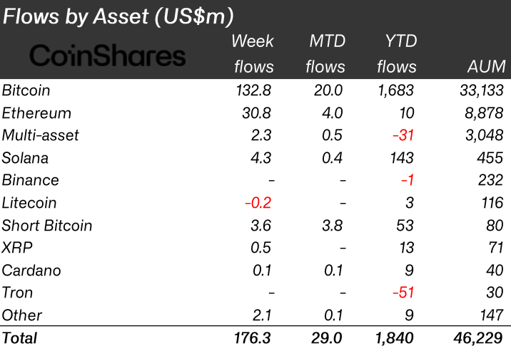 The anticipation of approval is leading to increased institutional capital inflows. Over the last 10 weeks, there was a total of $1.76 billion of inflows, which is the highest on record since October 2021. The record inflows also produced net flows of Ether, hitting $10 million for the first time this year and $30 million in the past-week.