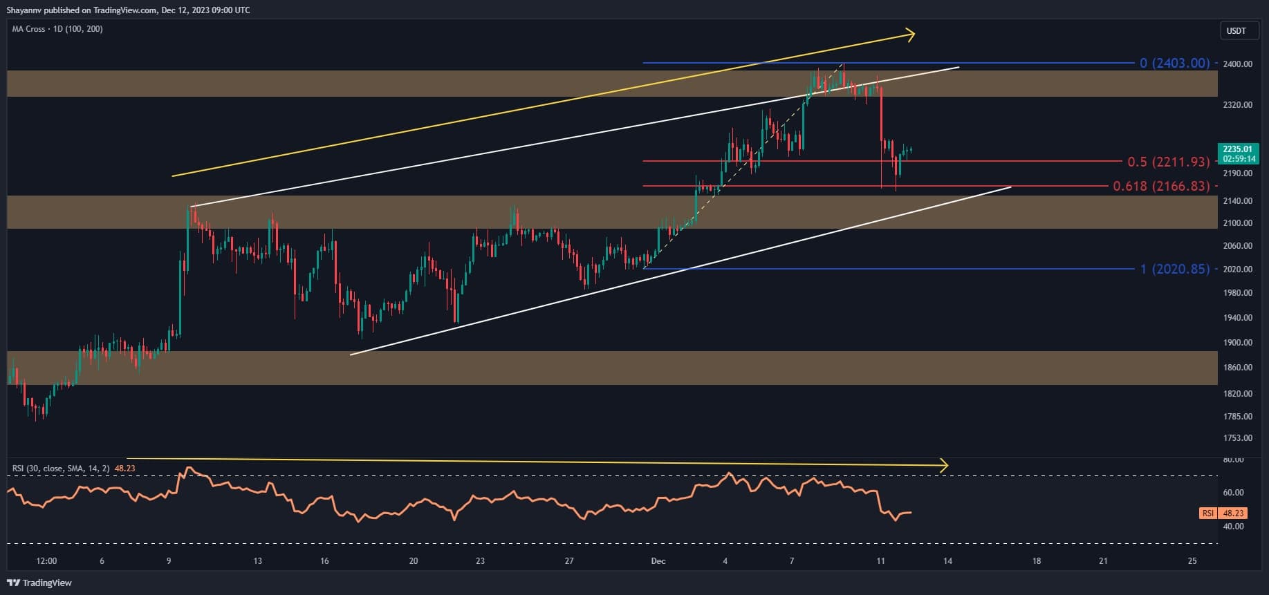It’s crucial to acknowledge that short-term corrections typically follow each bullish surge. As evident from the chart, Ethereum’s upward momentum faced rejection upon hitting the upper boundary of the wedge, resulting in a 10% decline.