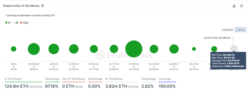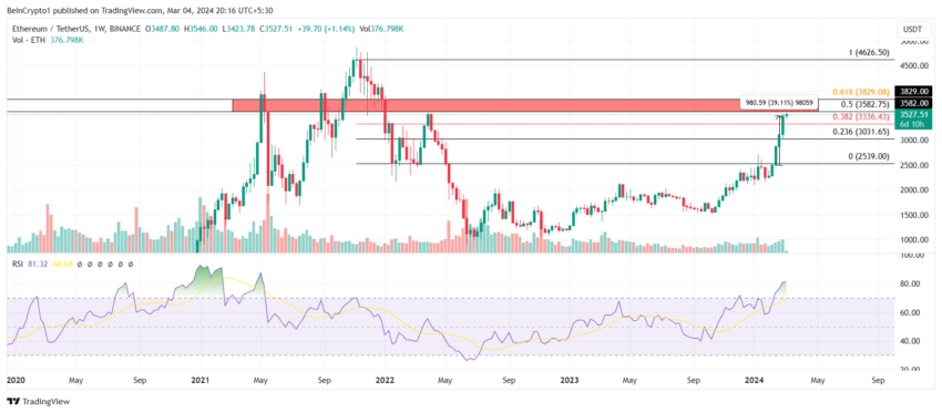 The Ethereum price, trading at $3,527 at the time of writing, has marked a 40% increase over the past three weeks, charting multi-month highs. The second-generation altcoin is now inching closer to testing the resistance zone between $3,582 and $3,829. This area has been a critical barrier for ETH for nearly three years.