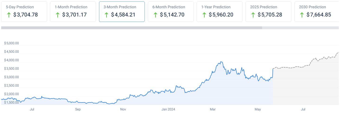“Technical analysis of historical ETH price patterns suggests the next high in 2024 could be around $5,314, which would be a 201% surge from the last swing low.”