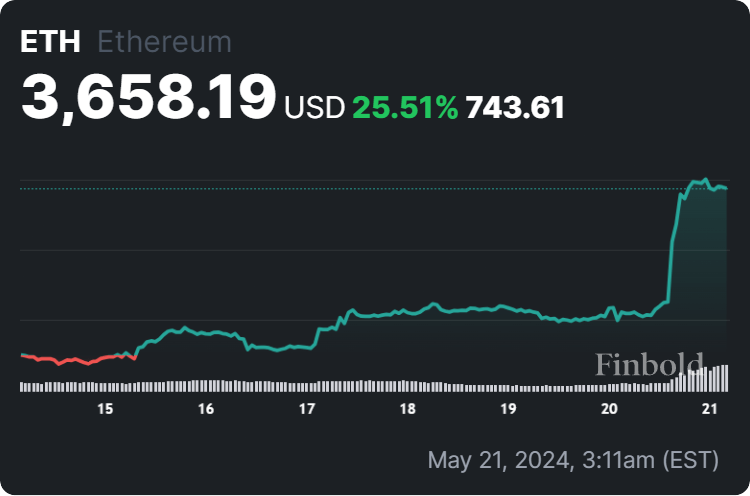 Presently, the largest altcoin in the crypto market is changing hands at the price of $3,658.19, suggesting an increase of 18.10% in the last 24 hours, adding up to the 25.51% gain in the previous seven days, and advancing 15.38% on its monthly chart, as per data on May 21.