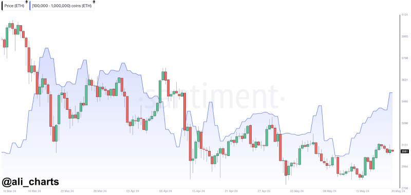 Meanwhile, popular crypto trading expert Ali Martinez has observed that Ethereum whales have bought over 110,000 ETH, worth about $341 million, in the 24 hours leading up to the time of his X post on May 20, suggesting a massive increase in interest from the market’s largest holders.