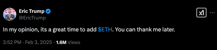 Eric Trump, son of the current US president, expressed optimism about Ethereum on social media, stating, “In my opinion, it’s a great time to add $ETH. You can thank me later.”