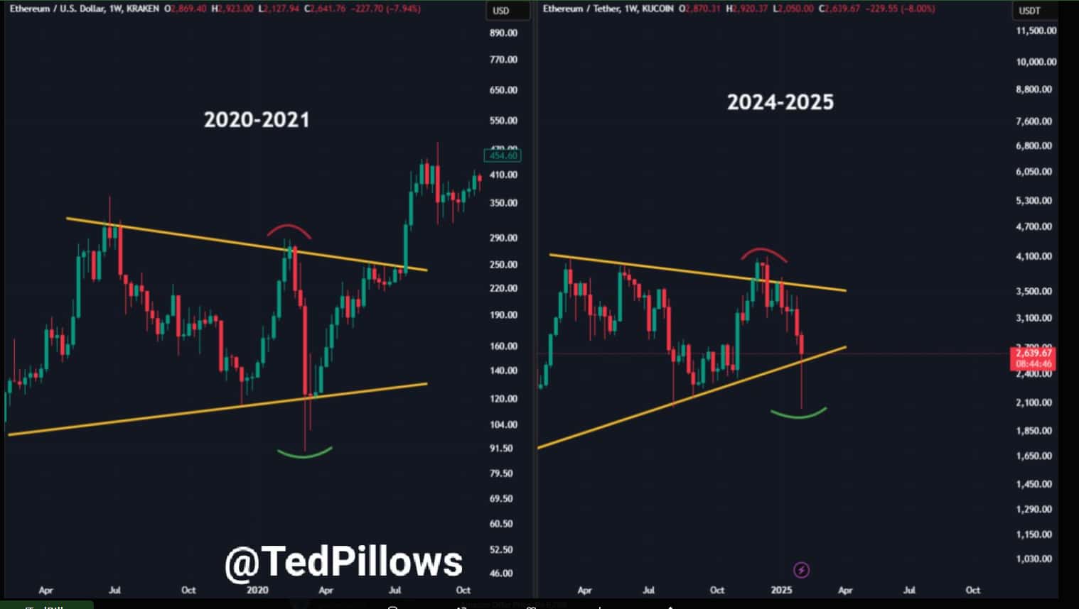An analysis by TedPillows highlights Ethereum’s recent capitulation candle, which mirrors the sharp downturn seen in March 2020. At that time, ETH faced a major downturn, leading many to believe the asset’s bullish trajectory was over—only for it to rebound and enter a bull run.