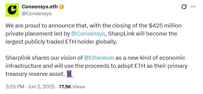 Sharplink noted its plans for a private investment round to raise $425 million. The company’s next step involves setting up its first Ethereum treasury from the proceeds.