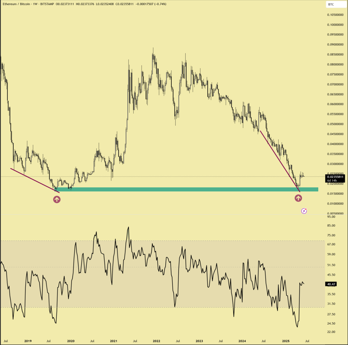 The third factor Axel points out is that the ETH/BTC ratio has dropped to its lowest level in six years. The weekly RSI has also hit a record low, suggesting ETH is currently oversold. This often signals a potential trend reversal.