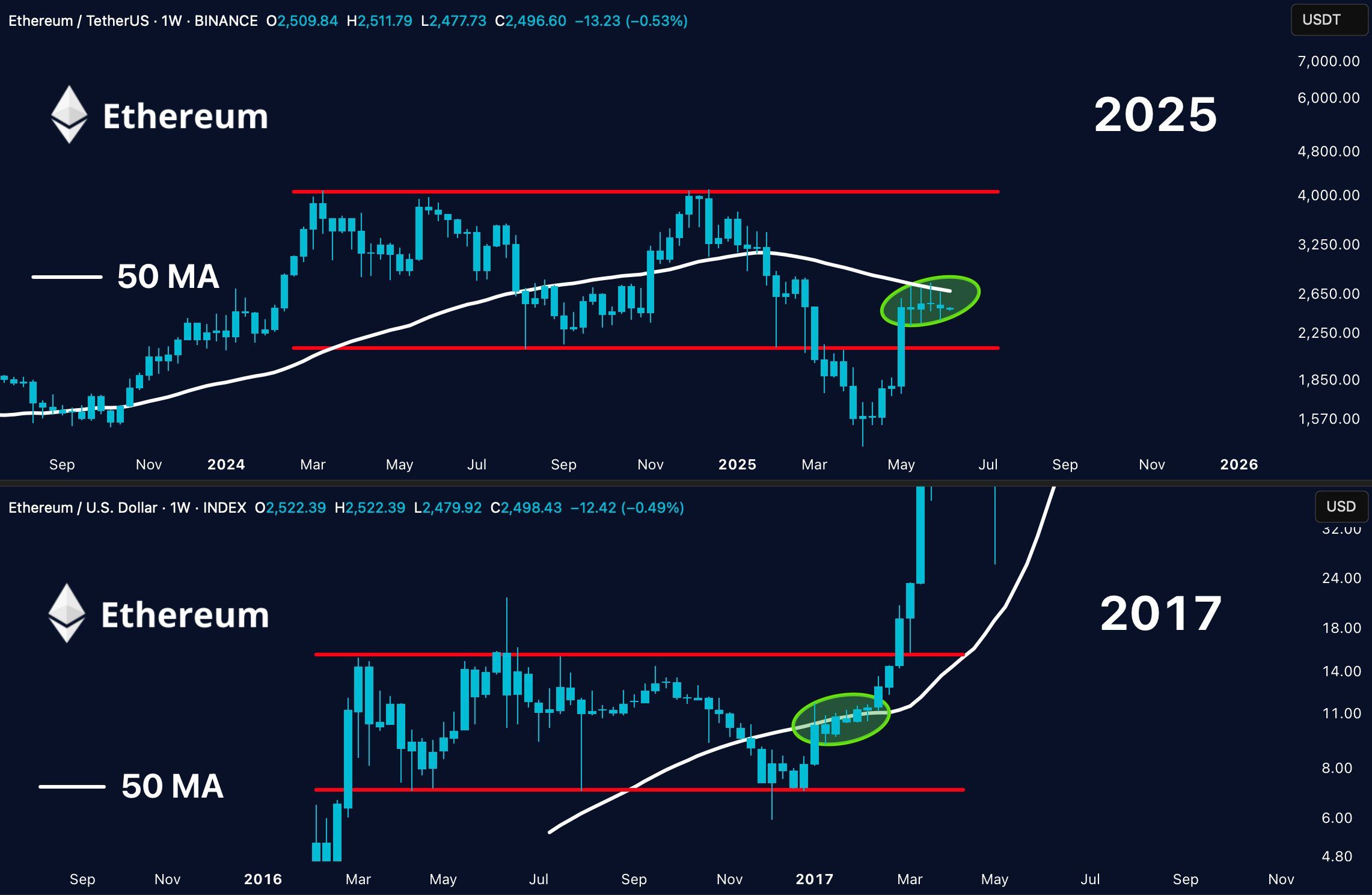 In addition to Axel Bitblaze’s analysis, veteran trader Merlijn The Trader compared ETH’s current price cycle to the 2017 bull run. He believes ETH is now structurally positioned for an even stronger breakout.