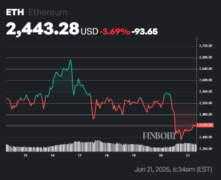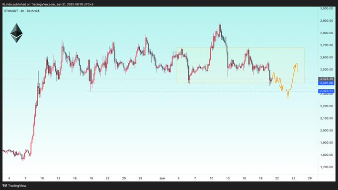 Looking ahead, crypto trading analyst RLinda pointed out in a June 21 post on X that Ethereum closed Friday’s session on a weak note, testing the important $2,391 support level.
