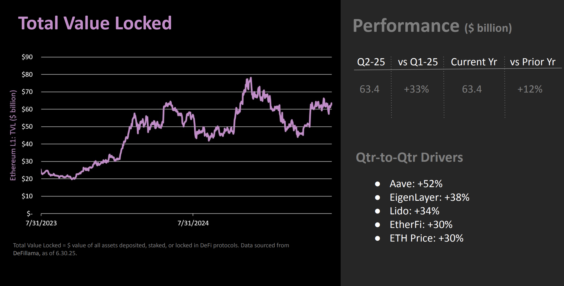 According to the report, Ethereum’s total value locked (TVL) surged 33% from the previous quarter, reaching $63.4 billion. This growth was fueled by a significant increase in stablecoins and real-world assets (RWA).