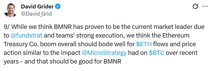 Meanwhile, David Grider, a partner at Venture capital firm Finality Capital, said in an X post on Monday that the Ether treasury company “boom should bode well for ETH flows and price action similar to the impact MicroStrategy had on Bitcoin,” which should be good for BitMine.