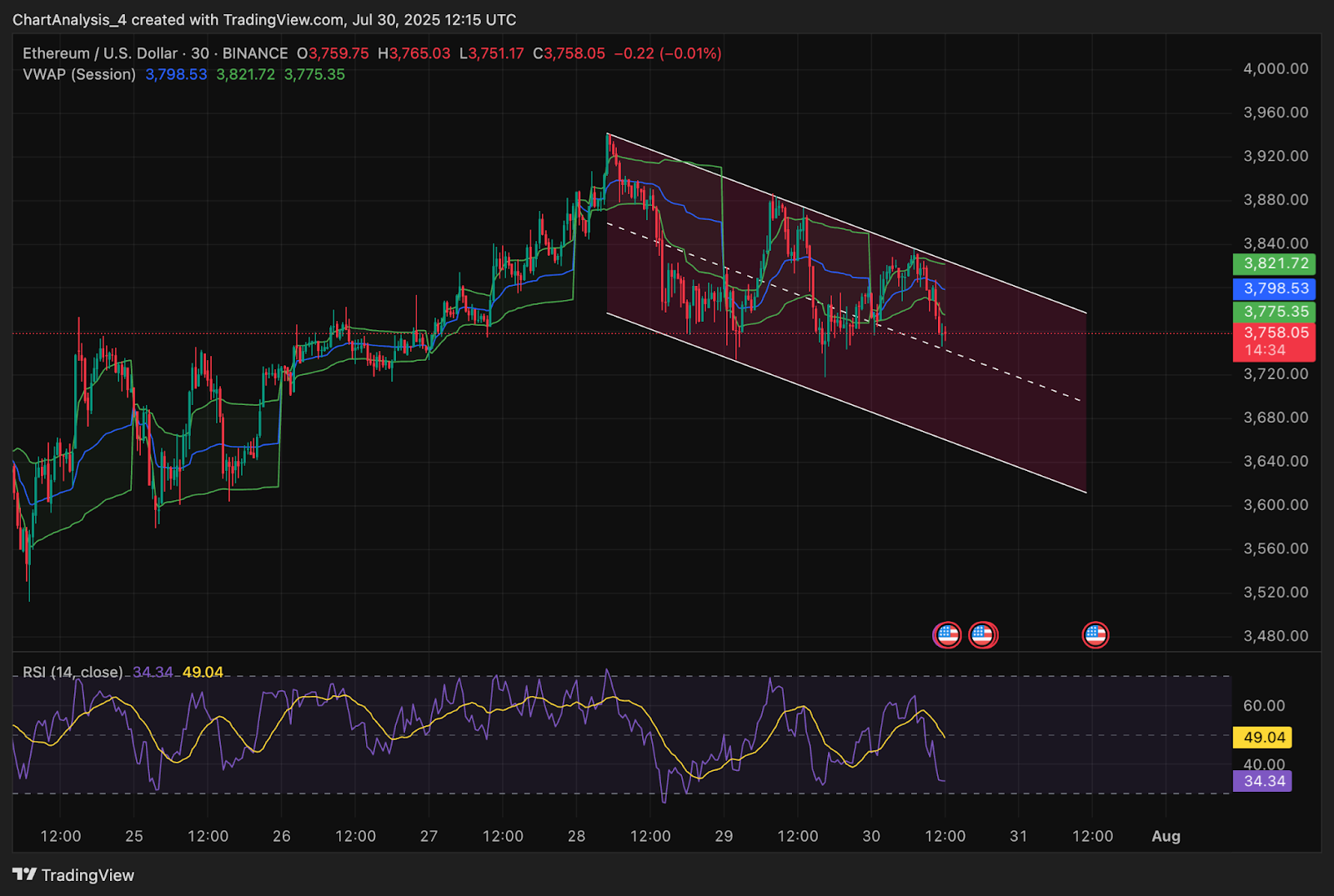 Despite strong macro bullish structure, short-term selling is emerging. On the 30-minute chart, Ethereum price action has broken into a declining channel, now oscillating between $3,820 resistance and $3,720 support. The RSI on this timeframe has dipped to 34.3, suggesting intraday weakness and a bearish bias unless reclaimed above 50. VWAP (Volume Weighted Average Price) is at $3,798, with ETH trading below it.