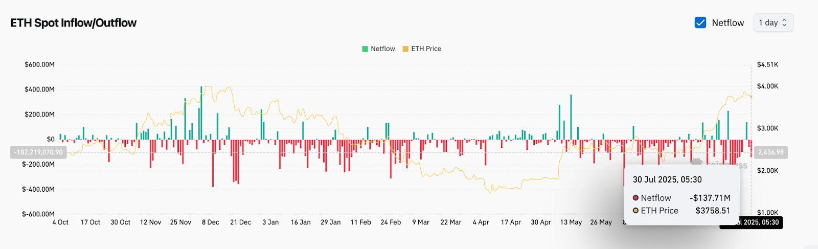 From a flows perspective, the spot net outflow stands at -137.71M as of July 30. This marks significant profit-taking and supports the current cooldown in Ethereum price.