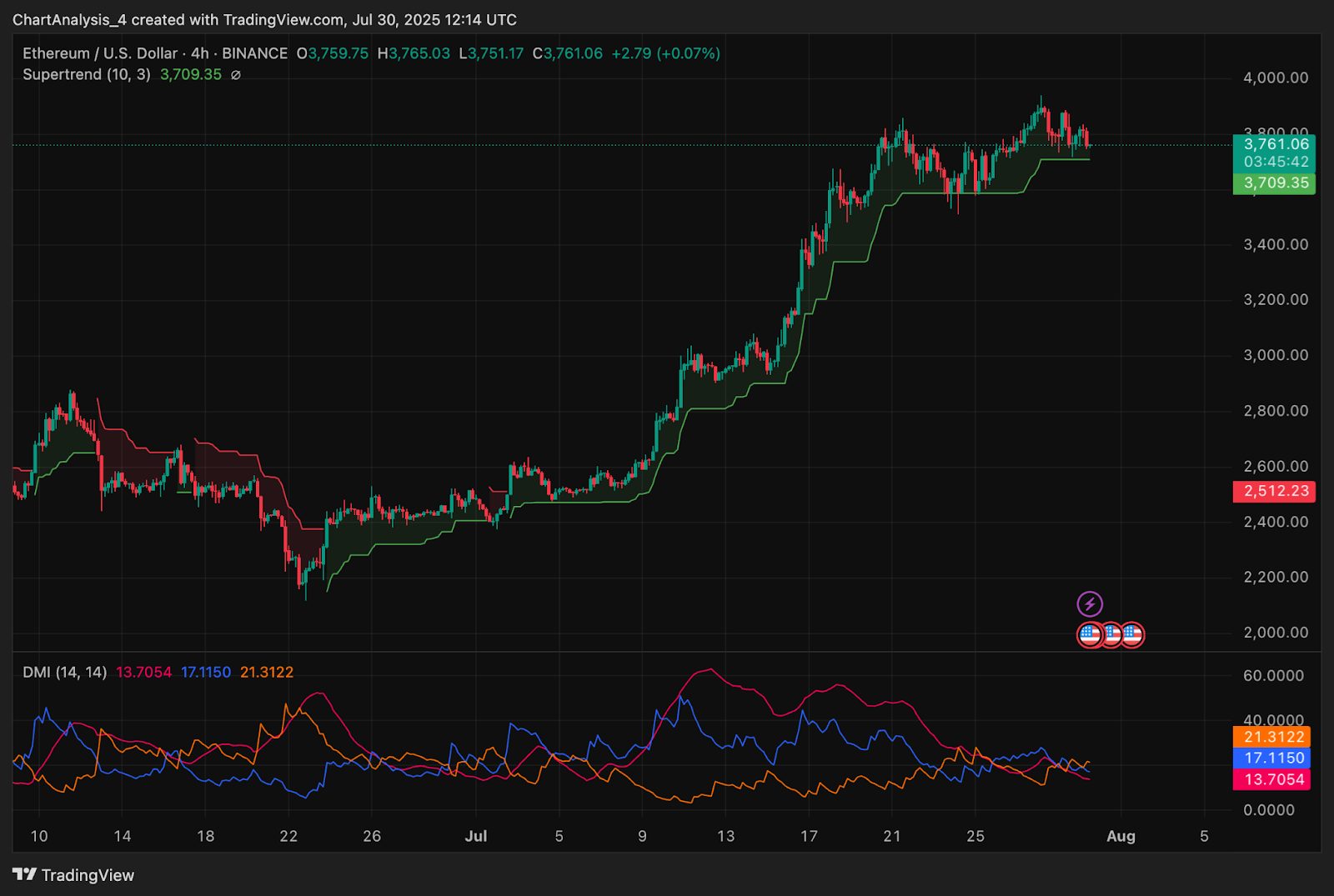 The Supertrend level at $3,709 is key. A breakdown below this could trigger a short-term liquidation move toward $3,516 or even $3,300. This reflects bearish sentiment in the short term. Meanwhile, the DMI (Directional Movement Index) on the 4-hour chart shows ADX losing strength while -DI is curling upward, indicating that buyers are losing control of the trend.