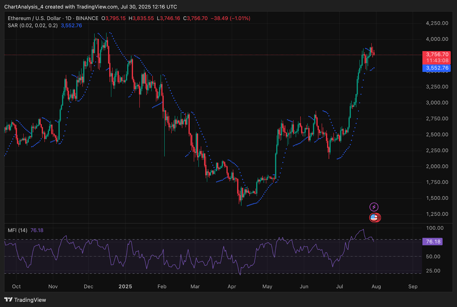 The Money Flow Index (MFI) is elevated at 76.18, indicating overbought conditions and possible distribution. The Parabolic SAR has also flipped closer to price, hinting at reversal risk if bulls fail to defend the $3,700 to $3,709 Supertrend zone.