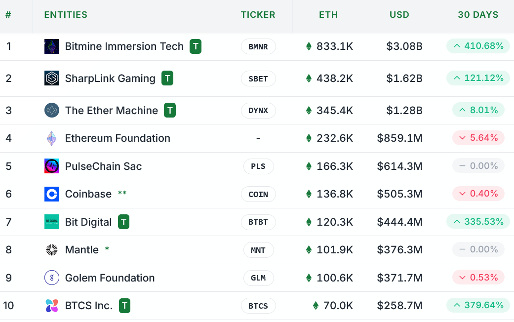 The Ethereum Foundation and PulseChain SAC round out the top five at 232,600 ETH and 166,300 ETH each, StrategicETHReserve data shows.