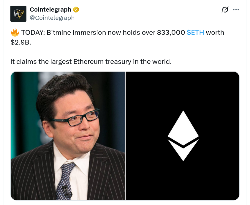 “BitMine moved with lightning speed in its pursuit of the ‘alchemy of 5%’ of ETH, growing our ETH holdings to over 833,000 from zero 35 days ago,” Lee said, adding: