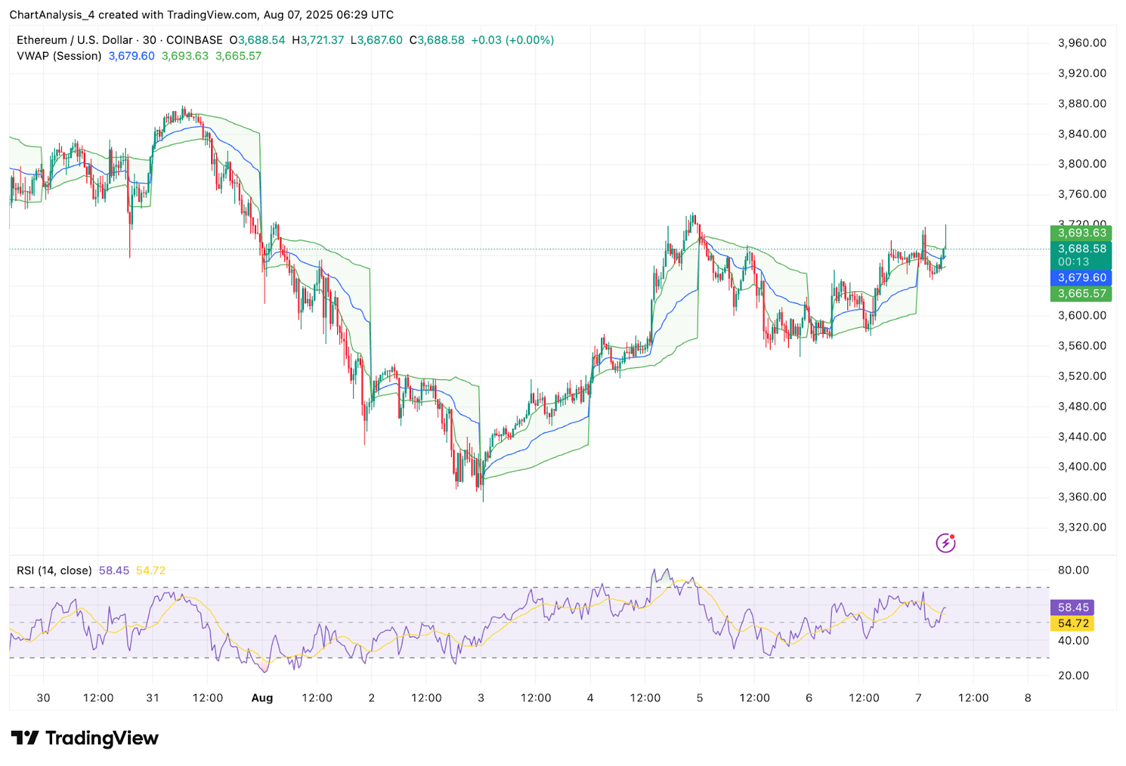 On the 30-minute chart, ETH is consolidating slightly above its VWAP band ($3,679), with RSI hovering near 58.45. The neutral RSI and narrow VWAP bands suggest a coiled structure that could break either way, though recent price spikes have found resistance just above the $3,700 handle.