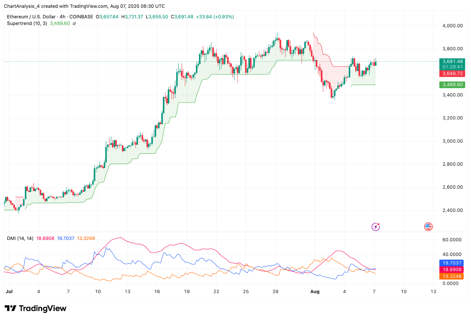The 4-hour Supertrend indicator has flipped back to bullish after holding above $3,489. While the recent bearish flip was short-lived, buyers now need to confirm this renewed signal with a strong push through $3,730.