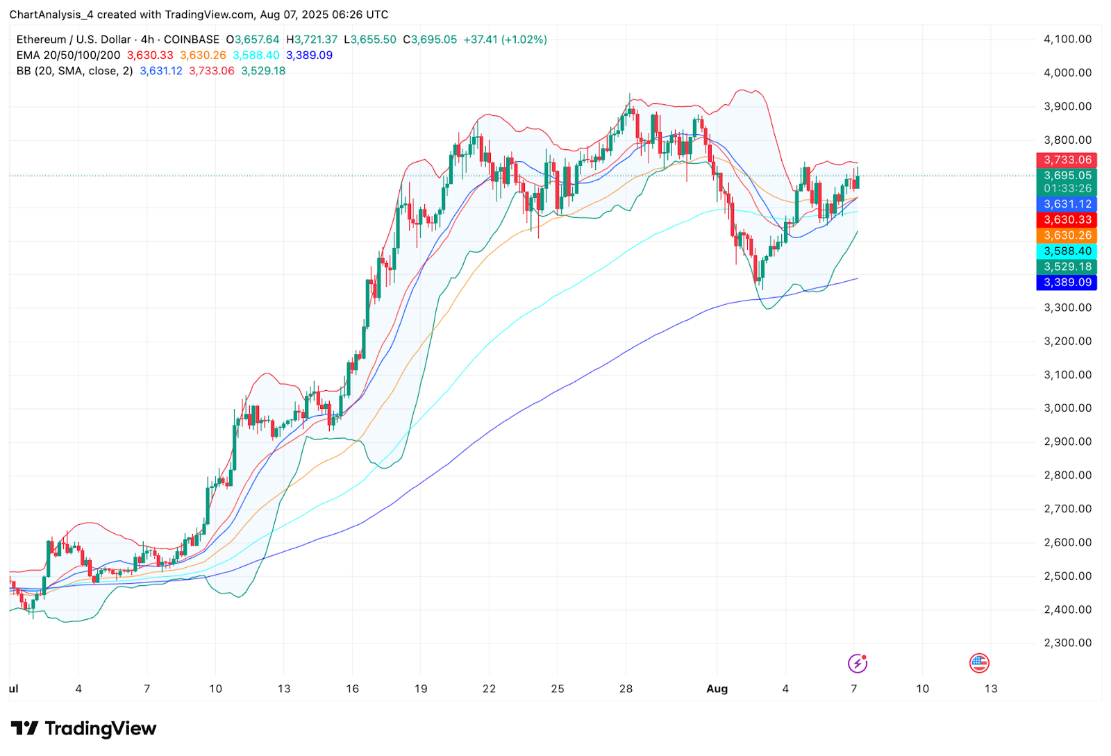 The 4-hour Bollinger Bands are compressing around $3,695, while candles show upper wicks, indicating hesitation from buyers. The 20/50/100 EMAs (currently at $3,630, $3,688, and $3,529 respectively) are stacked below price, confirming that momentum still leans bullish. That said, Ethereum must clear the $3,733 upper Bollinger Band with conviction to reinitiate upside flow.