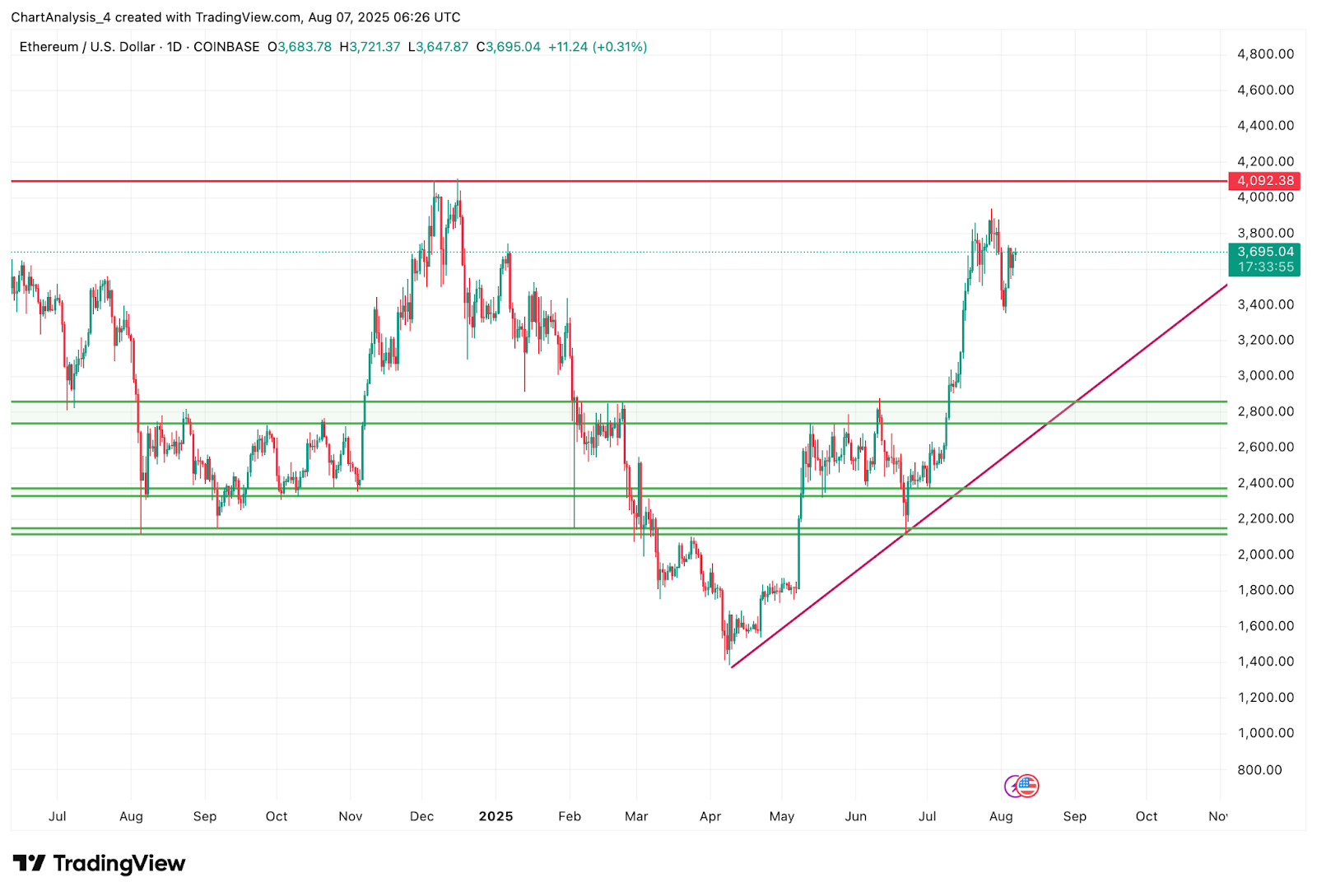 However, failure to clear this level risks dragging ETH back toward $3,630 support. A break below that would expose $3,529 (EMA100) and potentially test the rising trendline near $3,400.