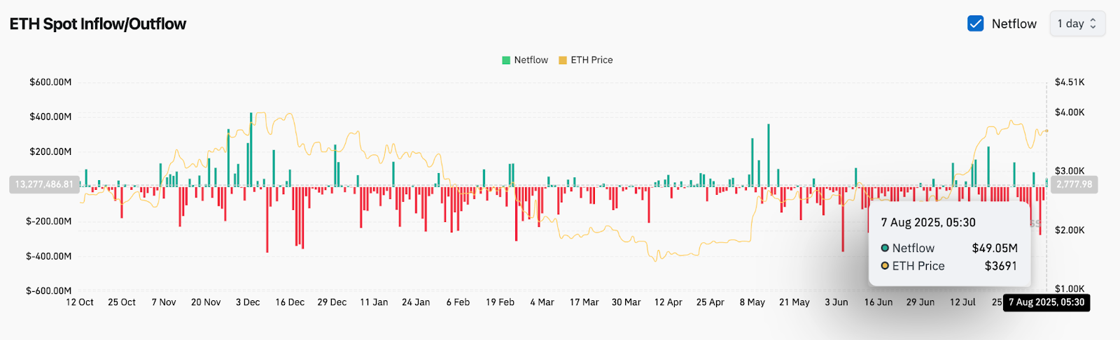 Meanwhile, Ethereum spot inflow/outflow data offers a positive cue. As of August 7, ETH saw a net inflow of $49.05 million, a notable uptick after weeks of outflow dominance. This inflow corresponds with the bounce off $3,655, hinting that institutional or smart money may be re-entering around this accumulation zone.