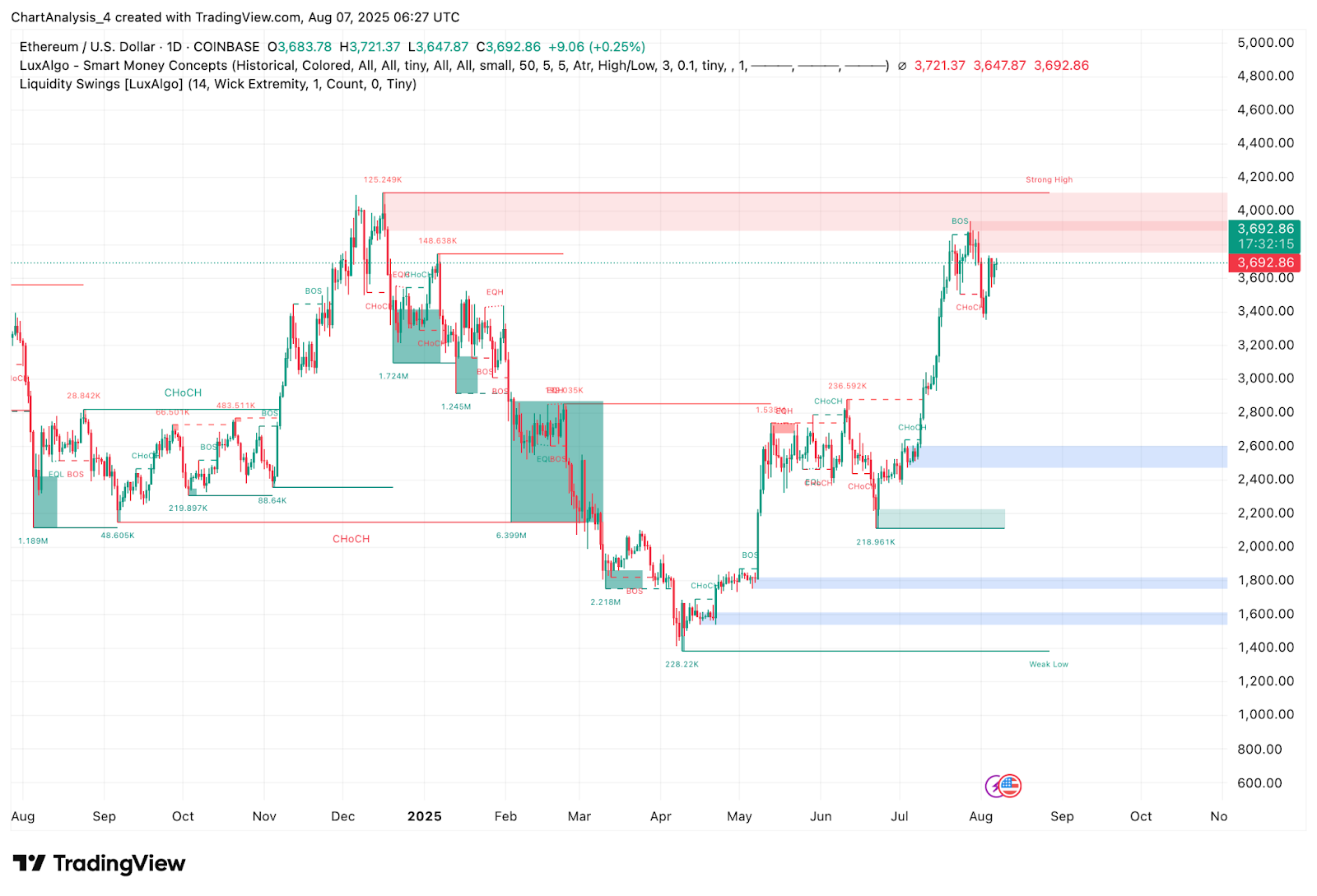 After rising above $3,800 in July, Ethereum price is consolidating just below a key supply zone that previously triggered steep rejections. The Ethereum price today is holding steady around $3,692, with buyers attempting to re-establish short-term dominance near a local demand zone. The key question now is whether bulls can sustain this strength and retest the $4,000 mark.