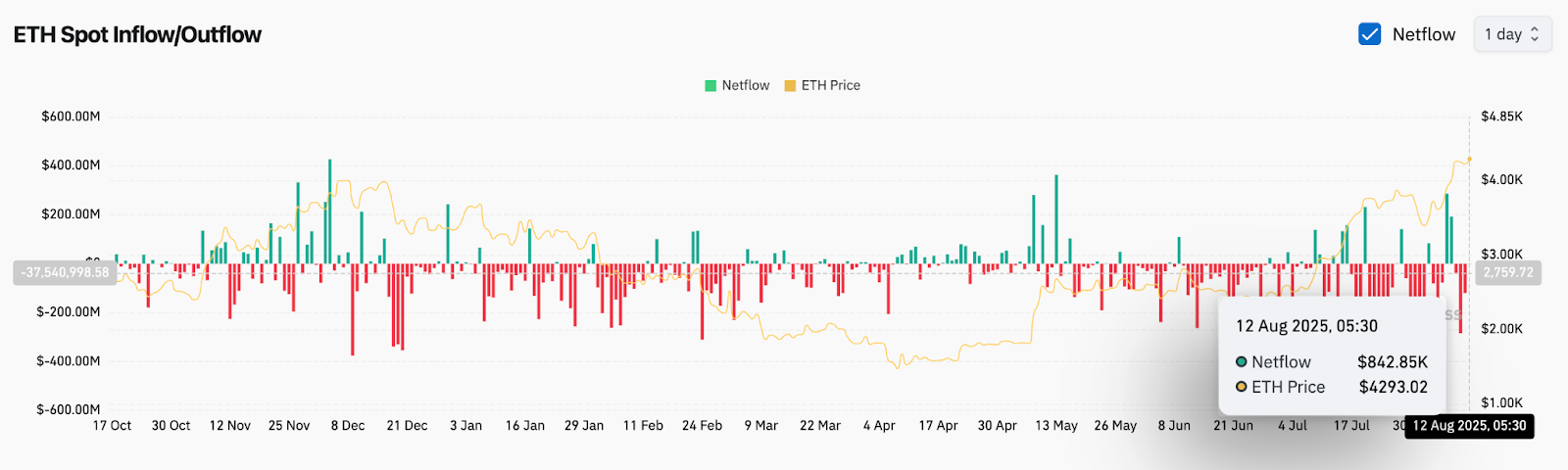 Spot exchange netflow for August 12 shows a positive $842.85K at $4,293.02. While modest, the inflow reflects supportive buying in the $4,250–$4,300 range, helping stabilize price during short-term pullbacks.